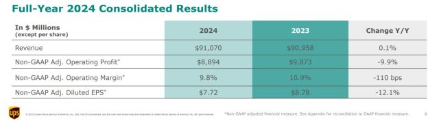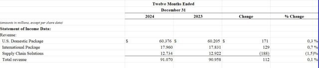 La gigante de logística estadounidense UPS dio a conocer sus ingresos consolidados del 2024. En ese período la multi facturó u$s 91.070 millones, apenas un 0,1% por encima de los u$s 90.958 millones de 2023. Ver Press Release