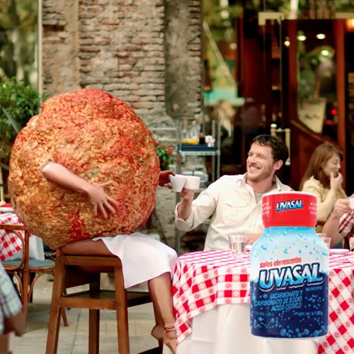 La albóndiga se enfrenta con el chico para ganar la guerra del malestar estomacal, mientras que una voz en off remata con el ya utilizado claim: «Cuando tu comida favorita te pelea, defendete rápido con Uvasal». Así la pieza finaliza con el joven y la albóndiga tomando un café como si nada hubiera pasado.