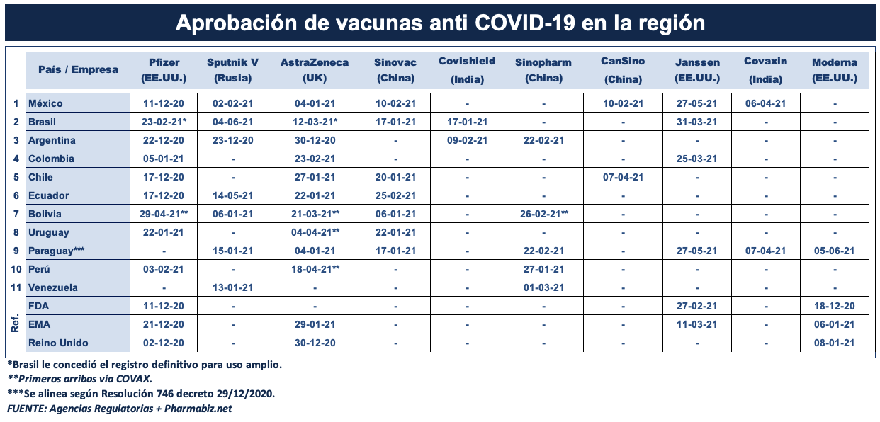 Paraguay alinea sus autorizaciones de acuerdo a la aprobación emitida por agencias regulatorias de referencia, tales como la FDA, la EMA y, en la región, como la COFEPRIS y la ANVISA. Esta decisión se oficializó a través de la resolución 746, según decreto del 29 de diciembre del año pasado. Todas las vacunas adquiridas y donadas al Estado ingresan al programa de Salud Pública para ser aplicadas de manera gratuita a la población. Ver Resolución 746.