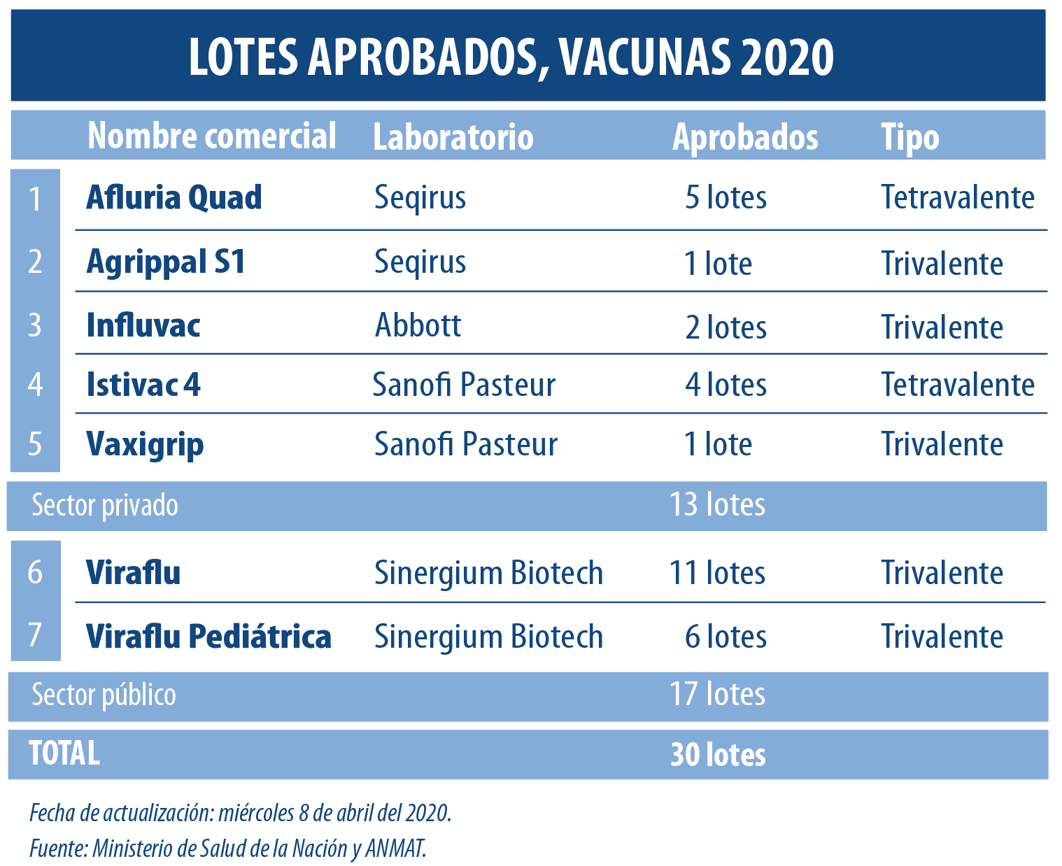 La ANMAT aprobó hoy 6 nuevos lotes de vacunas antigripales. Las mismas se suman al listado que se viene reforzando desde fines de febrero cuando se oficializaron las primeras dosis. Ver artículo febrero.