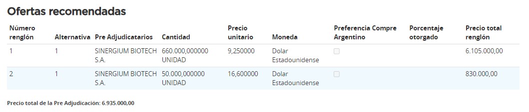 Según el desglose realizado por el equipo de Pharmabiz, solo resultó recomendada una de las tres empresas que se habían anotado en la compulsa. El consorcio Sinergium Biotech, capitaneado por Hugo Sigman, fue seleccionado con su marca Vaxipat para cubrir el total solicitado, con una oferta que alcanza los u$s 6.9 millones. Así, la erogación, podría superar el presupuesto asignado. Ver Dictamen de Evaluación.