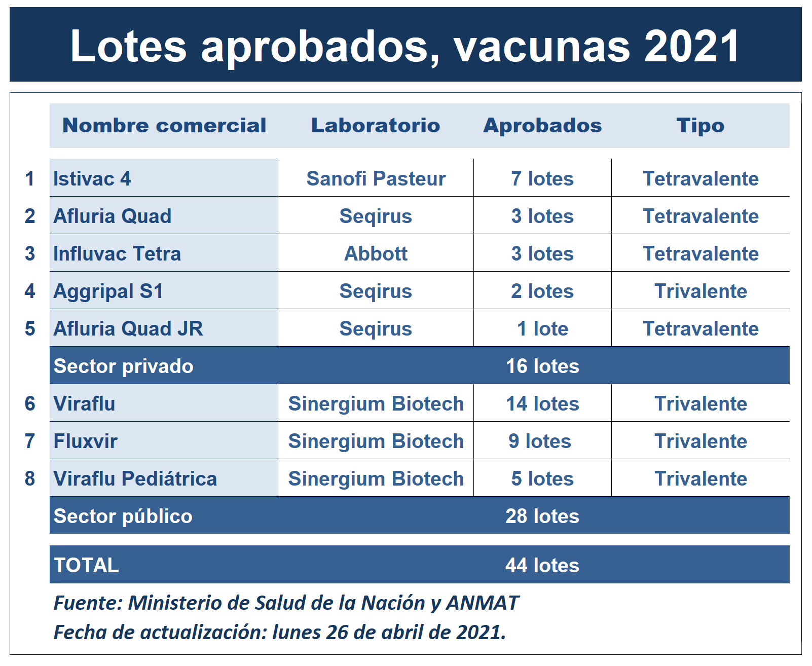 Por sexta vez en el mes de abril, la ANMAT actualizó el listado de vacunas antigripales para esta temporada 2021. La agencia regulatoria autorizó una nueva partida de Fluxvir -la vacuna trivalente del consorcio público privado Sinergium Biotech– y llegó a un total de 44 vacunas aprobadas.
