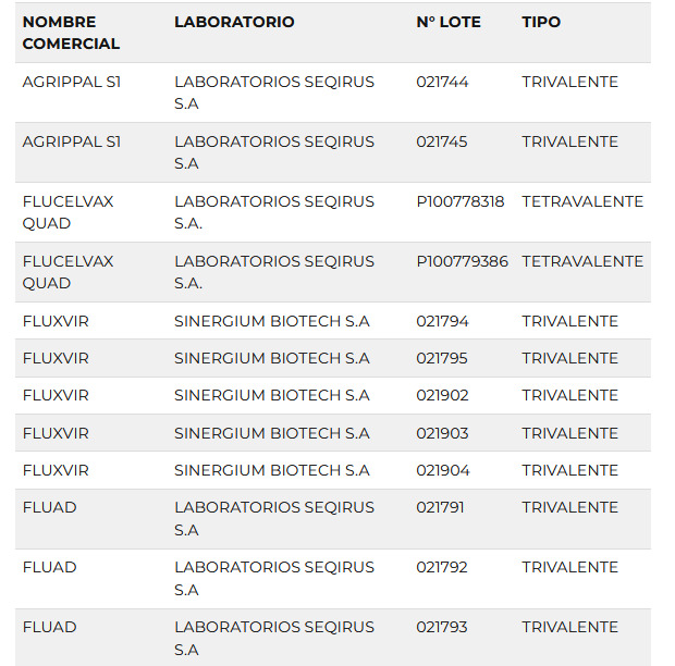 Al momento, la ANMAT lleva avalados 18 lotes de vacunas. Hay siete lotes de la australiana Seqirus. Dos lotes corresponden a su trivalente inactivada Agrippal S1; dos lotes a su tetravalente Flucelvax Quad; y tres a su trivalente Fluad. Todas se comercializarán en el canal de farmacias y vacunatorios. Ver Lotes ANMAT