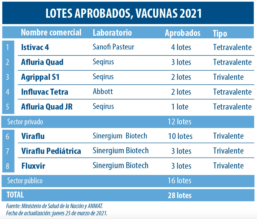 La campaña de vacunación antigripal 2021 suma nuevas partidas. Hoy la ANMAT avaló más productos que se incorporaron tanto al canal privado como al público. Ver listado al jueves 25/03/2021.