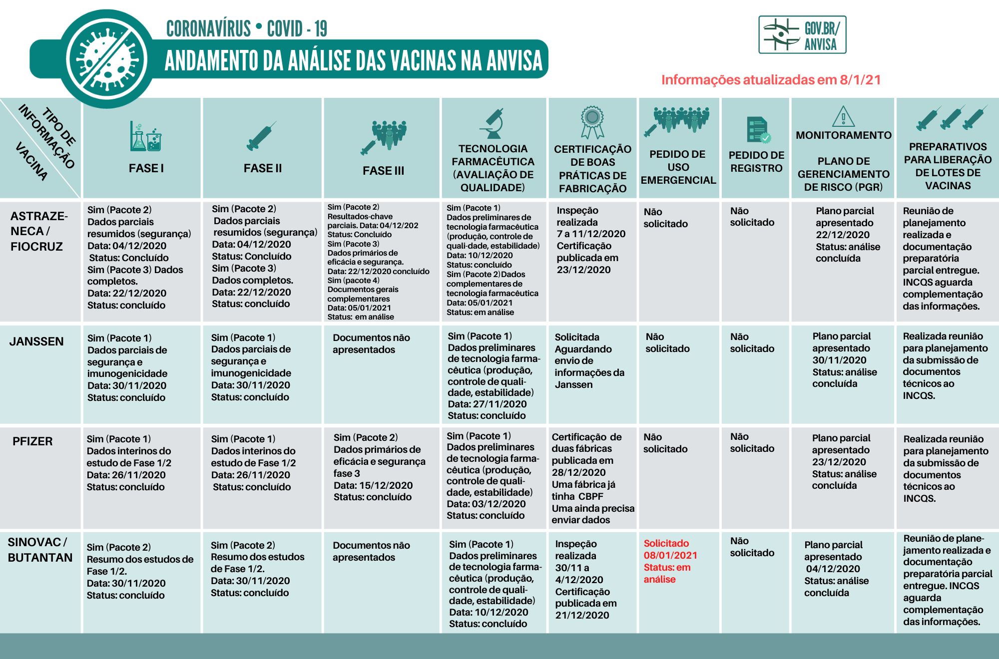 Al momento, la que se constituye en una gran incógnita es la ANVISA de Brasil. El organismo, que a mediados de diciembre determinó un plazo de 10 días para responder a las solicitudes de vacunas anti COVID-19, aún no otorgó ningún uso de emergencia y se mantiene a la fecha sin autorizaciones. Aunque hoy viernes 8 de enero el Instituto Butantan le elevó el pertinente pedido para la vacuna CoronaVac, de la china Sinovac. La agencia regulatoria consignó que se encuentra evaluando su aprobación, por lo que la vacuna de Sinovac podría ser la primera en obtener el visto bueno en Brasil. Otra que está en carpeta pero aún no es oficial es la vacuna de AZ que mantiene un convenio con Fiocruz. Ver check list vacunas Brasil al 8/1/21 Ver artículo.