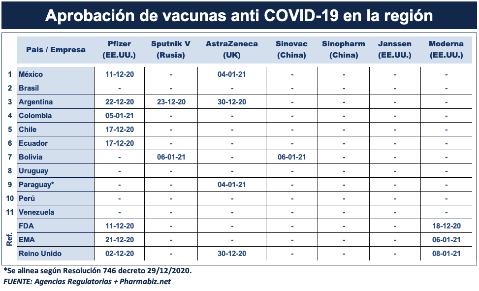 América Latina tiene su propio cronograma de aprobaciones para las vacunas anti COVID-19. En este contexto, las principales agencias regulatorias se están sacando chispas para marcar terreno y reposicionarse como referentes regionales. Ver cuadro debajo
