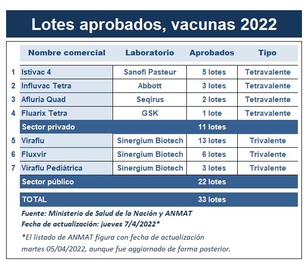 La nómina de vacunas antigripales se sigue amplificando. Hasta el momento, la ANMAT ya le dio el visto bueno a un total de 33 partidas, de las cuales 22 son para el sector público y 11 para el privado. Ver listado al 07/04.