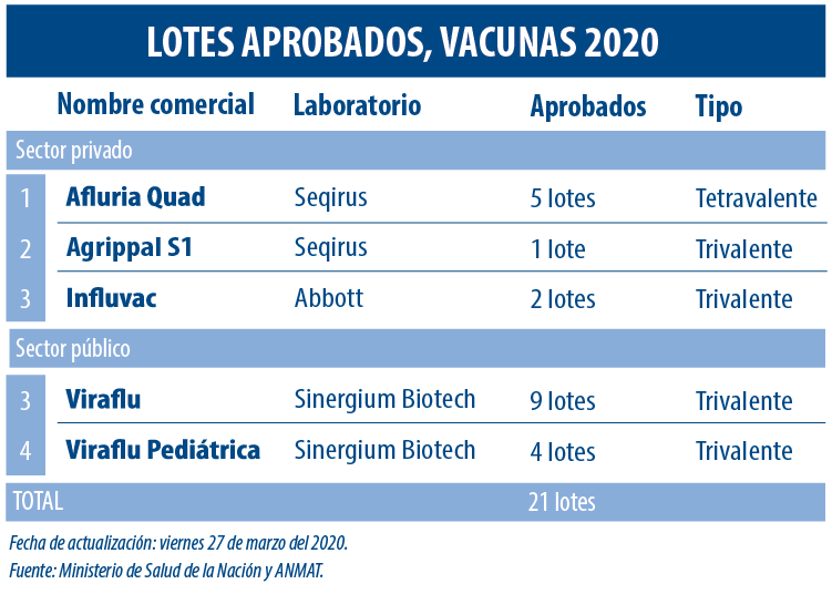 Para el sector público, en tanto, el consorcio Sinergium Biotech que tiene como cara visible a Hugo Sigman obtuvo la aprobación de un total de 13 lotes de su vacuna Viraflu. De esa cifra, cuatro corresponden a la versión pediátrica. Las mismas se distribuyen en los centros de atención primaria de la salud. Ver artículo