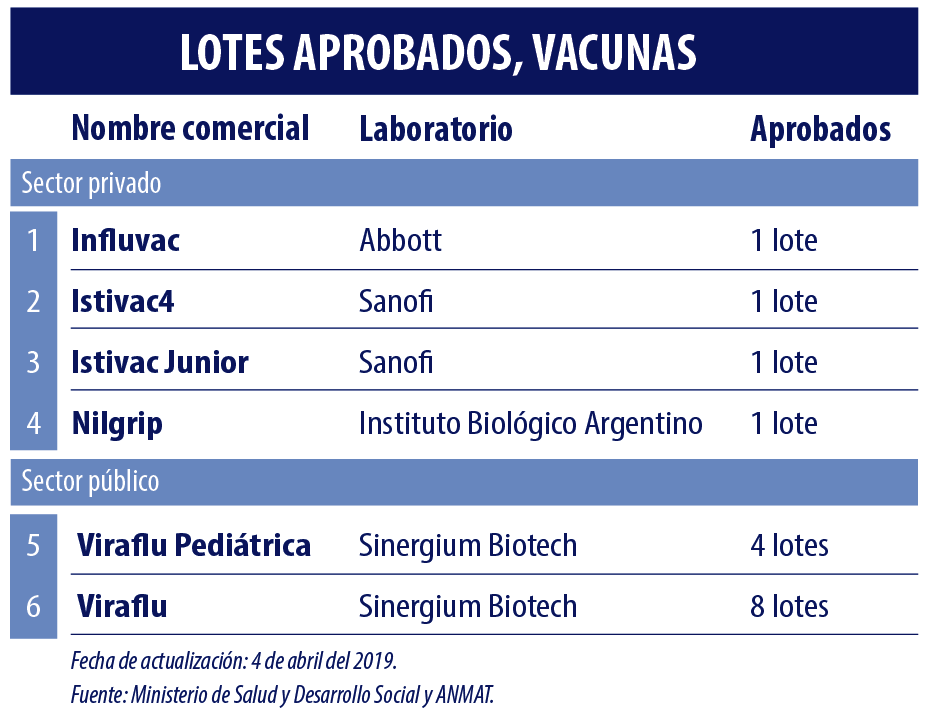 En el ámbito privado también participa la norteamericana Abbott, con un lote de Influvac; y el Instituto Biológico Argentino con un lote de Nilgrip. El año pasado las primeras partidas se habían aprobado en el mes de marzo con un arranque de siete lotes. Ver artículo.