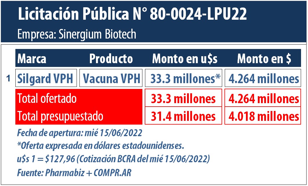 Según el desglose realizado por el equipo de analistas de Pharmabiz, el proceso que fue solicitado por la Dirección de Control de Enfermedades Inmunoprevenibles tiene como único oferente al consorcio público-privado Sinergium Biotech. La empresa, cuyo principal referente es Hugo Sigman se presentó con la marca Silgard VPH.