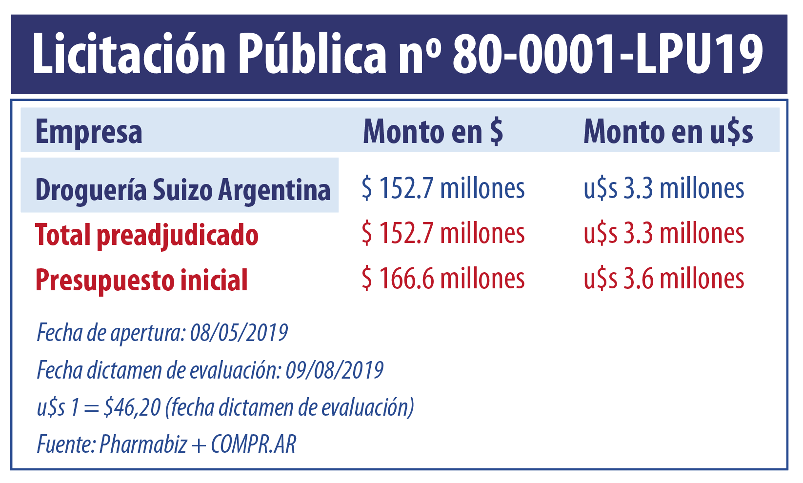 u$s 1 = $46,20 (cotización del 09/08/2019 – fecha de publicación dictamen de evaluación).