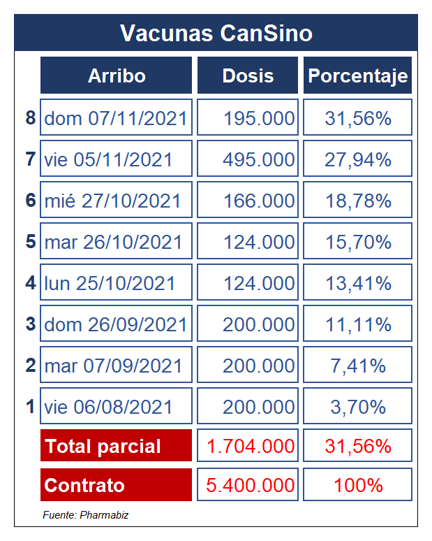Con estos dos cargamentos, el total de vacunas monodosis recepcionadas en el marco del contrato suscripto entre el gobierno local y la farmacéutica asciende recién a 1.7 millones, lo cual representa el 31.56% de las 5.4 millones estipuladas. Si bien el producto había sido aprobado en el país en el mes de junio y, en el mismo día del anuncio, la ministra de Salud Carla Vizzotti, había confirmado el acuerdo por la provisión, las semanas pasan y los arribos son súper pequeños. Al momento, se anotaron ocho vuelos: uno en agosto; dos en septiembre; tres en octubre; y dos en noviembre. Ver artículo «Argentina aprueba la vacuna CanSino anti COVID».