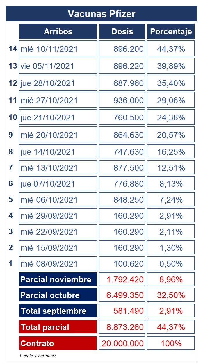 Al momento, la cantidad de vacunas made in Pfizer y BioNTech arribadas en el país asciende a 8.9 millones, la cual representa el 44,37% de lo comprometido mediante el deal. Se espera que la multi, la que es presidida en el país por el médico Nicolás Vaquer, complete los envíos hasta alcanzar las 22 millones de unidades antes de fin de año.
