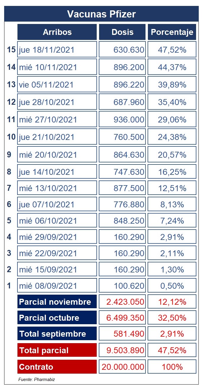 De esta manera, la norteamericana Pfizer todavía no alcanzó a cumplimentar al momento el 50% del acuerdo firmado en julio pasado entre las partes. Desde que se activó el contrato en septiembre, se recepcionaron 9.5 millones de unidades, de las 20 millones que están estipuladas. Ver Comunicado