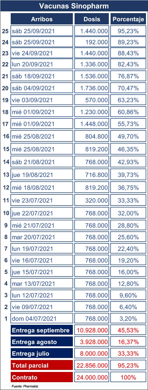 Según el relevamiento realizado por el equipo de Pharmabiz, con estos tres lotes, el Gobierno está cerca de dar por cumplimentado el contrato suscripto con la estatal China National Pharmaceutical Group, en julio pasado. Mediante el mismo, se había acordado el envío de 24 millones de vacunas en el trimestre que va de julio a septiembre. Al momento, a cinco días de que cierre el mes, la Argentina recibió 22.8 millones de unidades, lo cual representa el 95,2% de lo acordado.