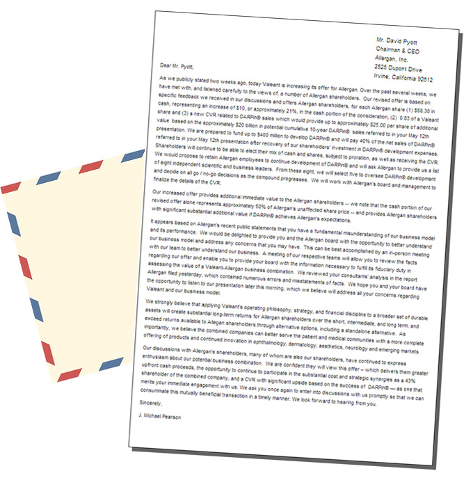 «Durante las últimas dos semanas, nos hemos reunido con los accionistas de Allergan y los hemos escuchado cuidadosamente. Fue así que revisamos nuestra oferta, basada en el feedback específico que recibimos de las discusiones», dijo Michael Pearson, en una carta remitida al consejo de Allergan.