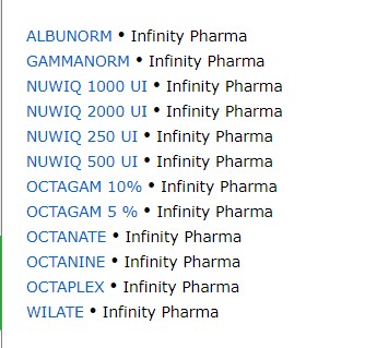 Según pudo saber Pharmabiz, la empresa perdió la licencia que mantenía con la suiza Octapharma desde el año 2004. Y ahora la cartera de productos conformada por el cuarteto de antihemofílicos Octanate, Octanine, Nuwiq, y Wilate; las inmunoglobulinas humanas Gammanorm y Octagam; el antihemorrágico Octaplex; y el expansor coloidal Albunorm, quedaron bajo el ala de la nueva firma Infinity.