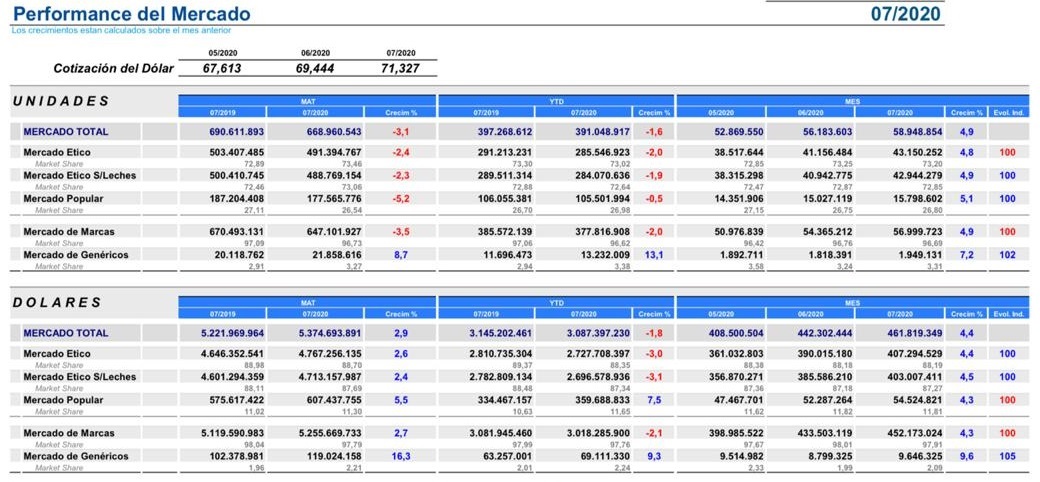 En lo que va del 2020, si se compara el acumulado a julio con el «year to date» del 2019, también se observa una variación negativa, con un retroceso del -1.6% para todo el mercado. Allí la suba en el negocio de genéricos es todavía mayor, del 13.1%, lo que muestra una tendencia sostenida.