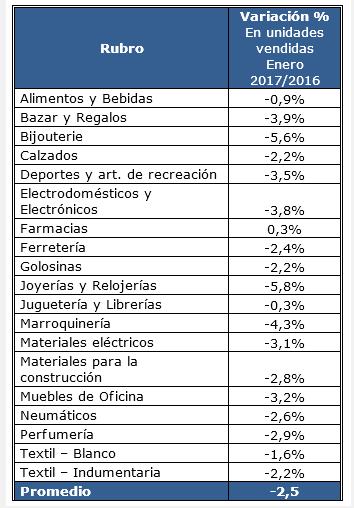 Los comercios minoristas sufrieron una caída del 2,5% en sus unidades vendidas durante enero, de acuerdo a la CAME. Sólo el sector farmacias esquivó la baja.