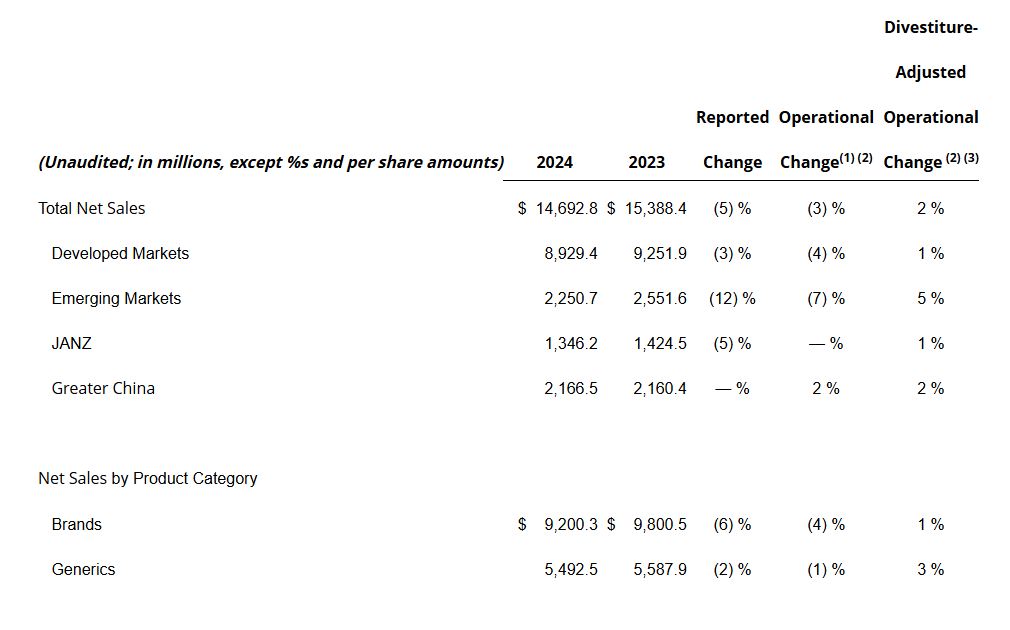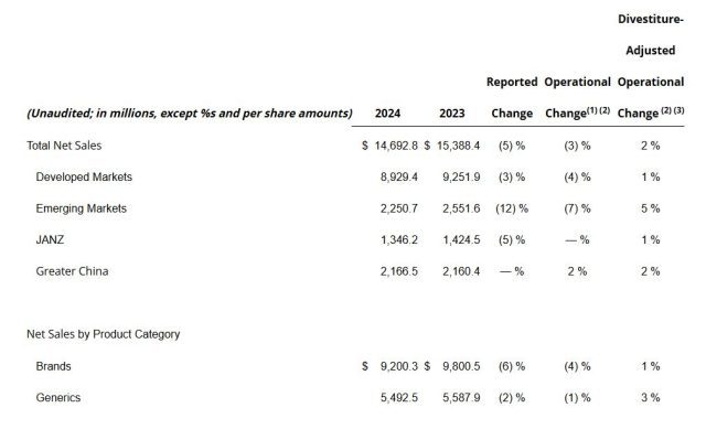 La multi detalló que la unidad que denomina Brands cayó -6% a u$s 9.200,3 millones, mientras que el negocio de Genéricos cerró el ejercicio económico con un retroceso del -2% en facturación a u$s 5.492,5 millones.