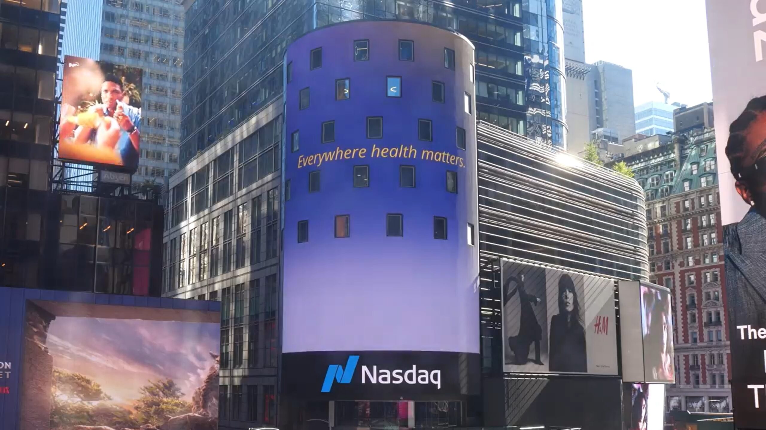 La secuencia termina con el mensaje “la salud importa en todas partes” sobre un fondo liso y con el logotipo de Viatris, su página web y el símbolo del Nasdaq. Nasdaq dice que su torre, que contiene 929 metros cuadrados de señalización, es vista por más de 350.000 personas cada día. Ver Sitio.
