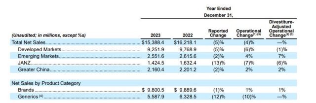 La multi detalló que la unidad que denomina Brands creció 1% a u$s 9.800,5 millones, mientras que el negocio de Genéricos cerró el ejercicio económico con un retroceso del -12% en facturación a u$s 5.587,9 millones.
