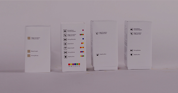 Bajo el slogan «encuentra la que se ajusta» cada forma geométrica tiene un color y representa una vitamina distinta para poder identificar la que mejor se adapta a las necesidades del consumidor.