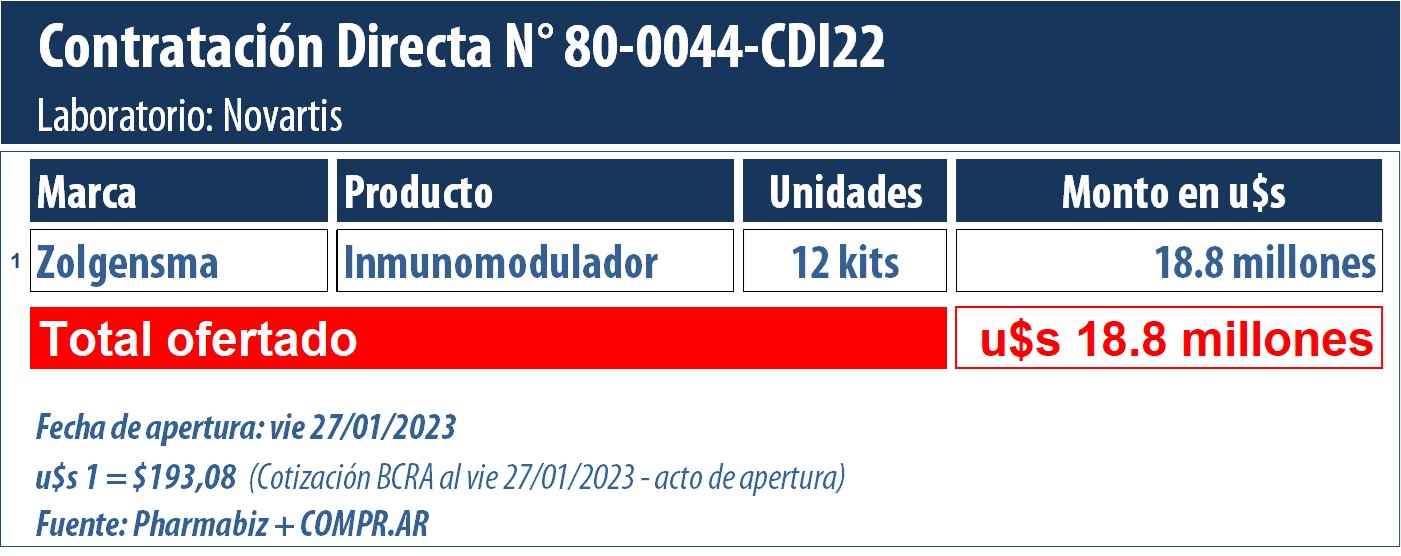 Para esta contratación, catalogada bajo la modalidad de orden de compra abierta, y para la cual se estableció un contrato de 12 meses, se definió un presupuesto de u$s 18.8 millones. En su oferta, la suiza Novartis indicó un precio unitario por kit de u$s 1.5 millones, con IVA incluido. Ver Cuadro Comparativo